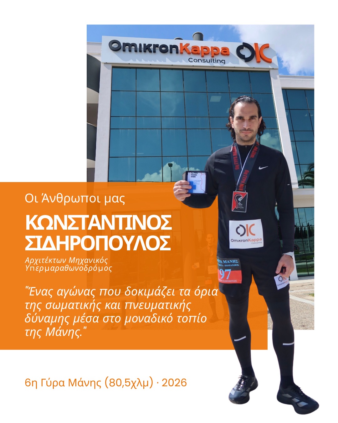 Με ιδιαίτερη χαρά μοιραζόμαστε τη συμμετοχή του συναδέλφου μας, Κωνσταντίνου Σιδηρόπουλου, Αρχιτέκτονα Μηχανικού και υπερμαραθωνοδρόμου της Όμικρον Κάπα Μελετητική, στην 6η Γύρα Μάνης, έναν ιδιαίτερα απαιτητικό αγώνα υπεραπόστασης 80,5 χιλιομέτρων που πραγματοποιήθηκε στις 7 Μαρτίου 2026.